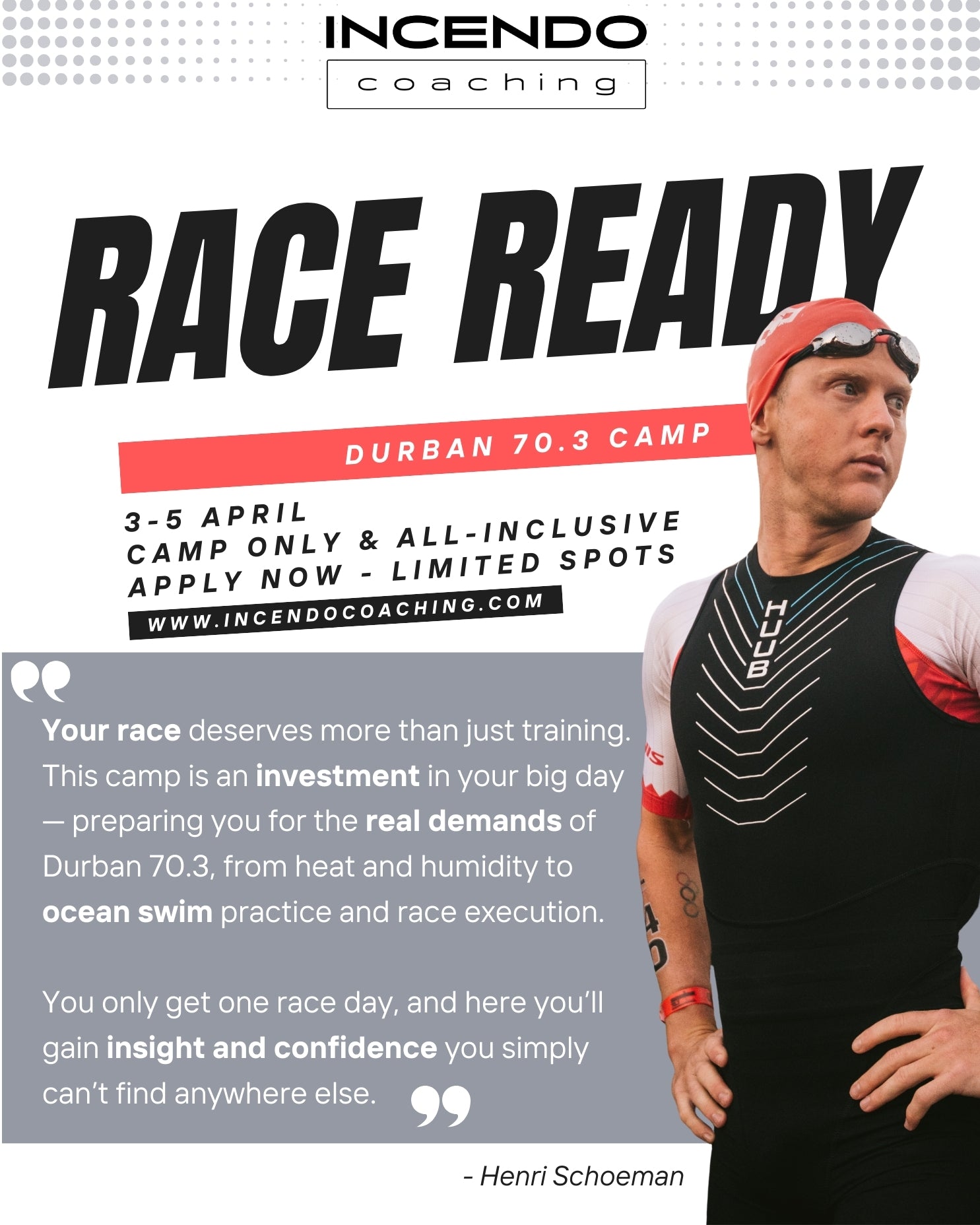 Led by Henri Schoeman —Olympic medalist, Commonwealth Games Champion, World Champion and 70.3 IRONMAN Champion.